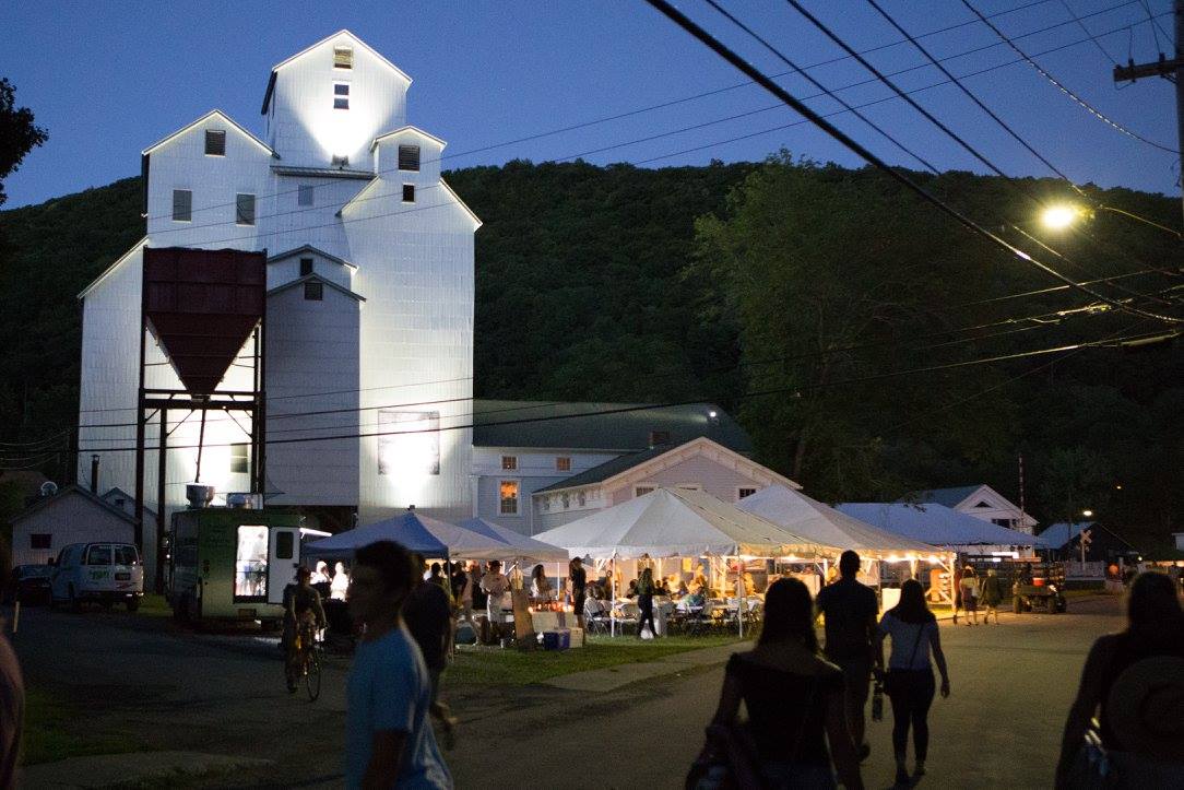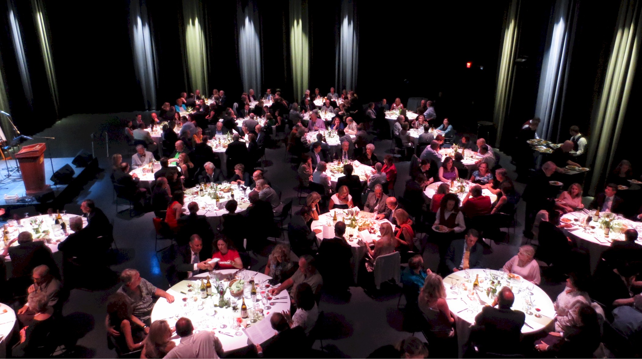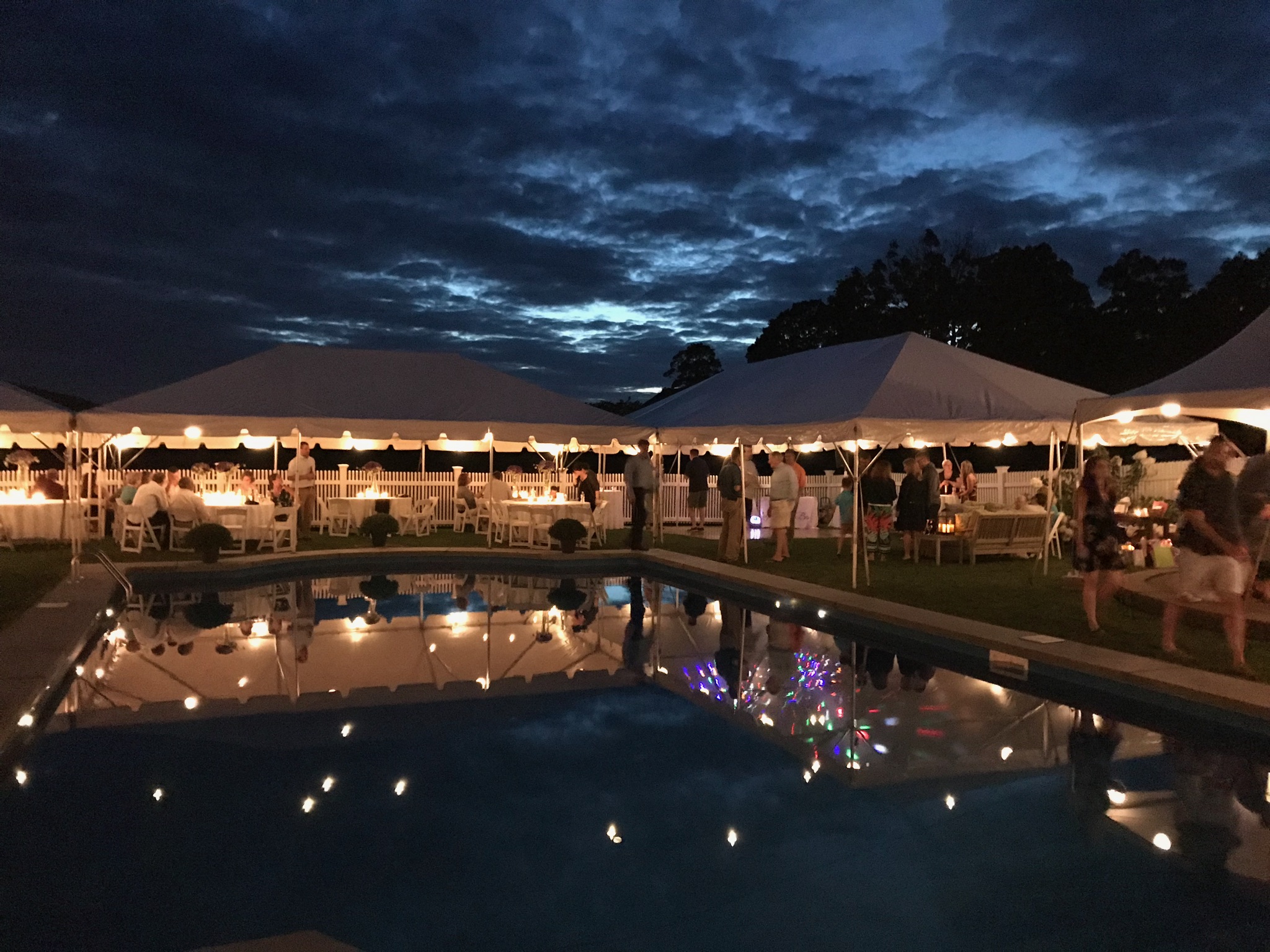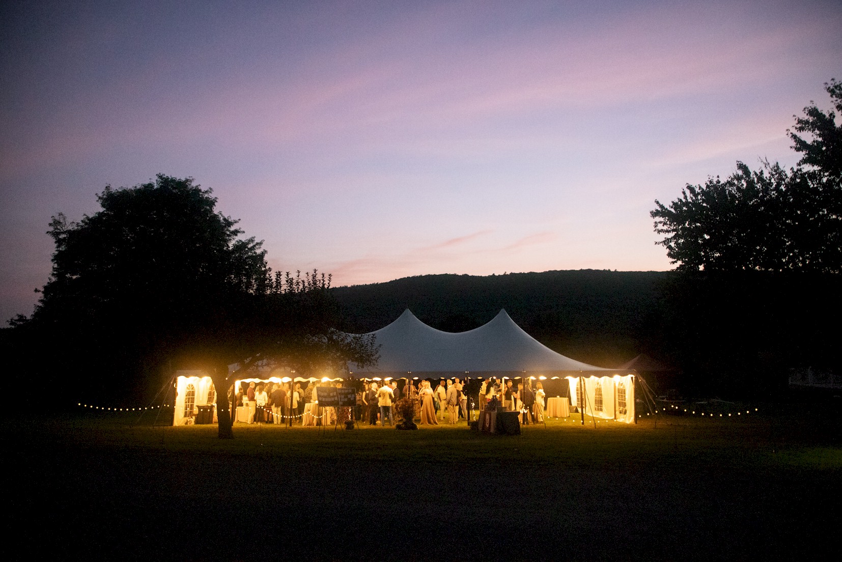 Tent at night with people eating at tables and globe lights