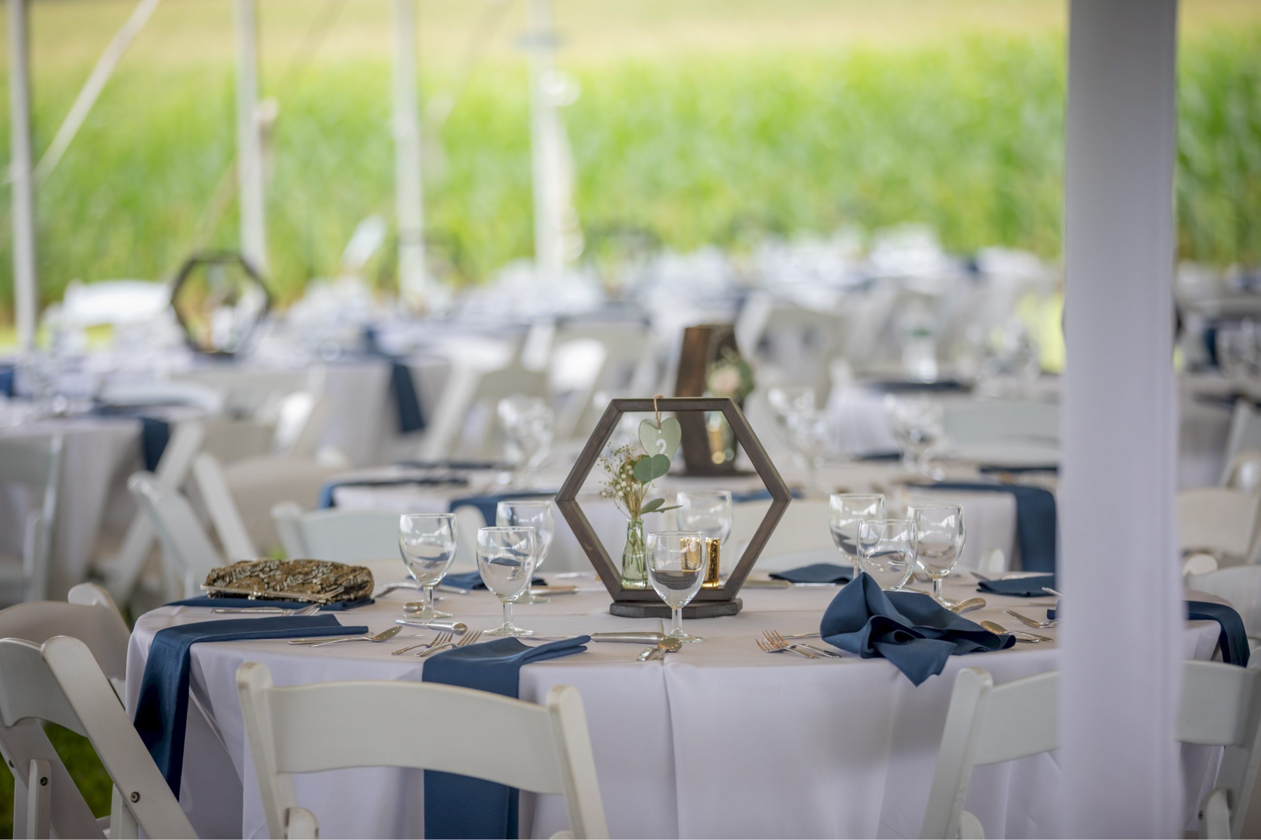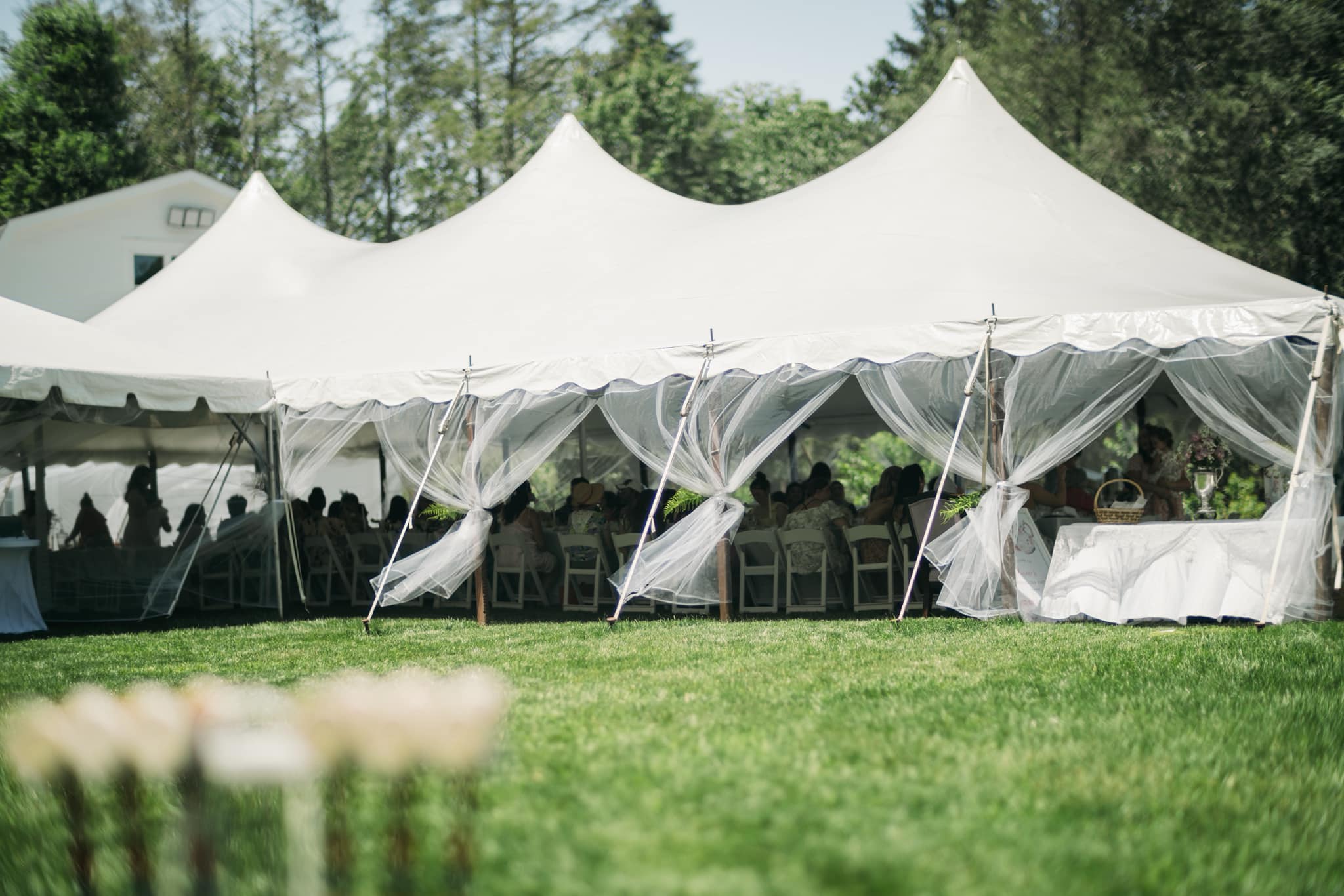 Frame tents with tables set before a wedding