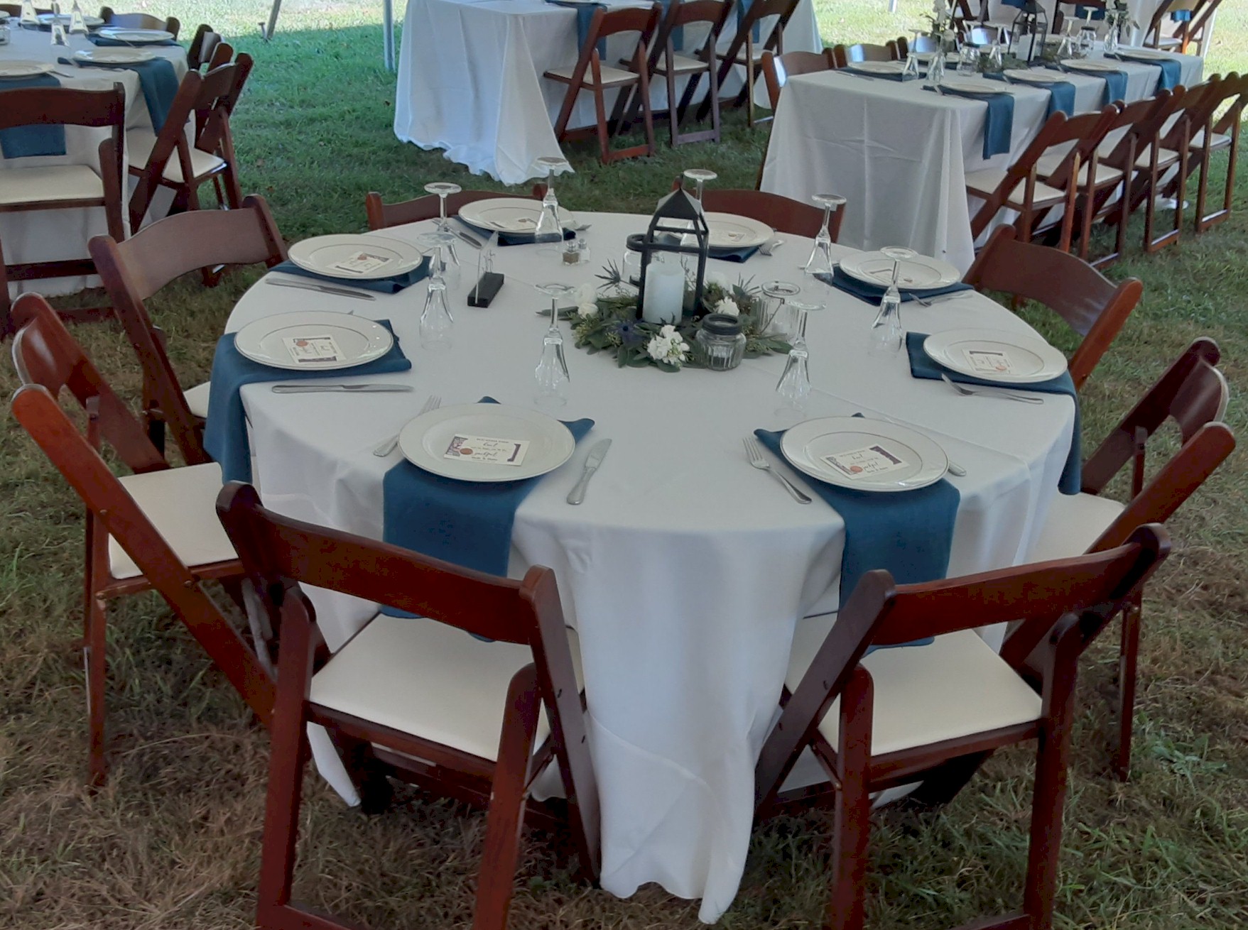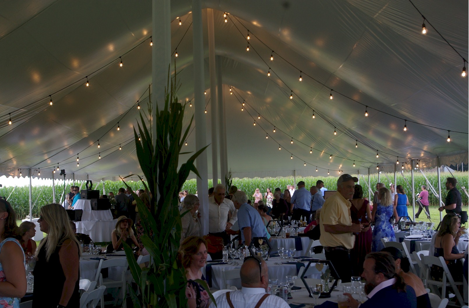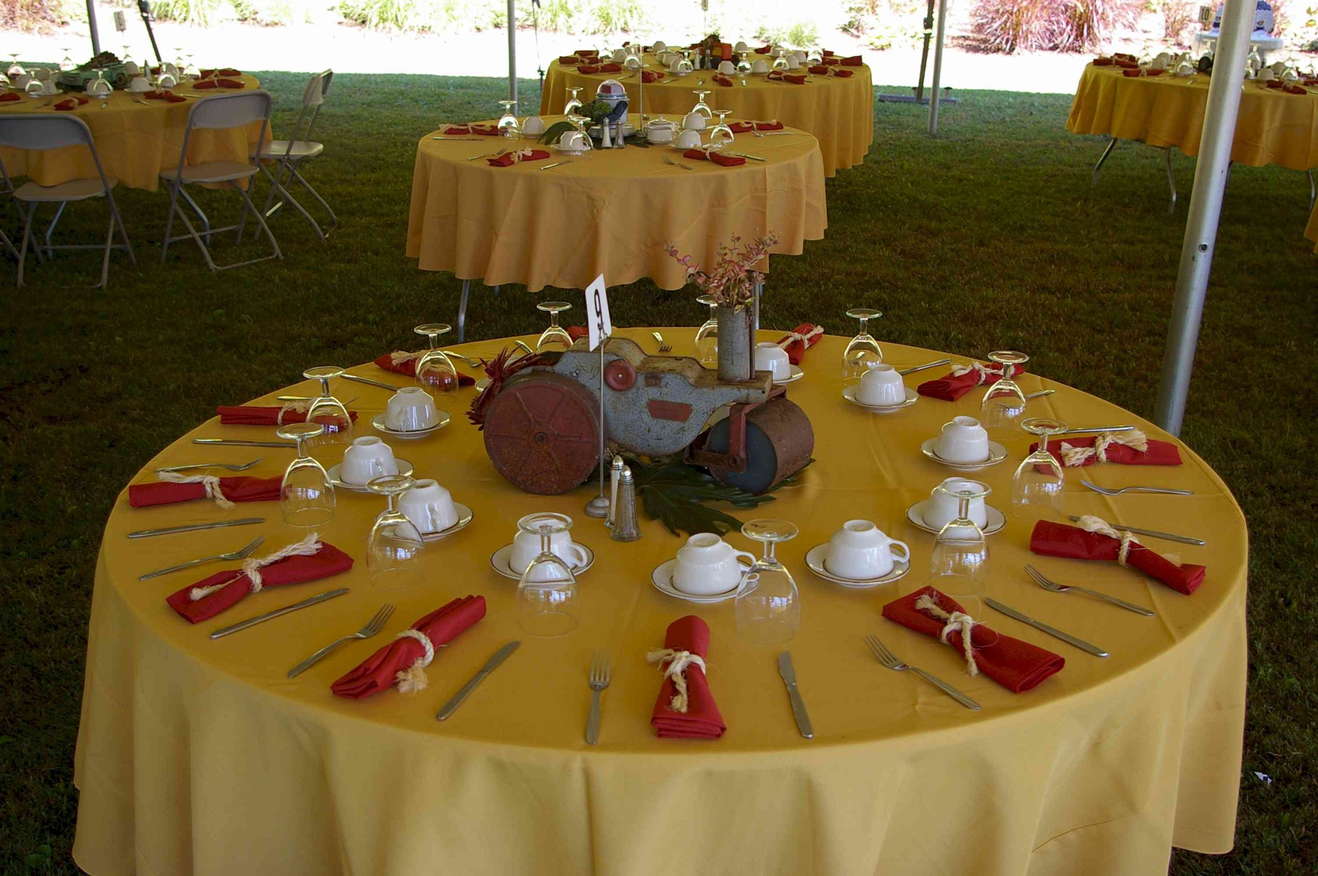 Large pole tent with decorated center poles, Full table settings with linens and chairs covers
