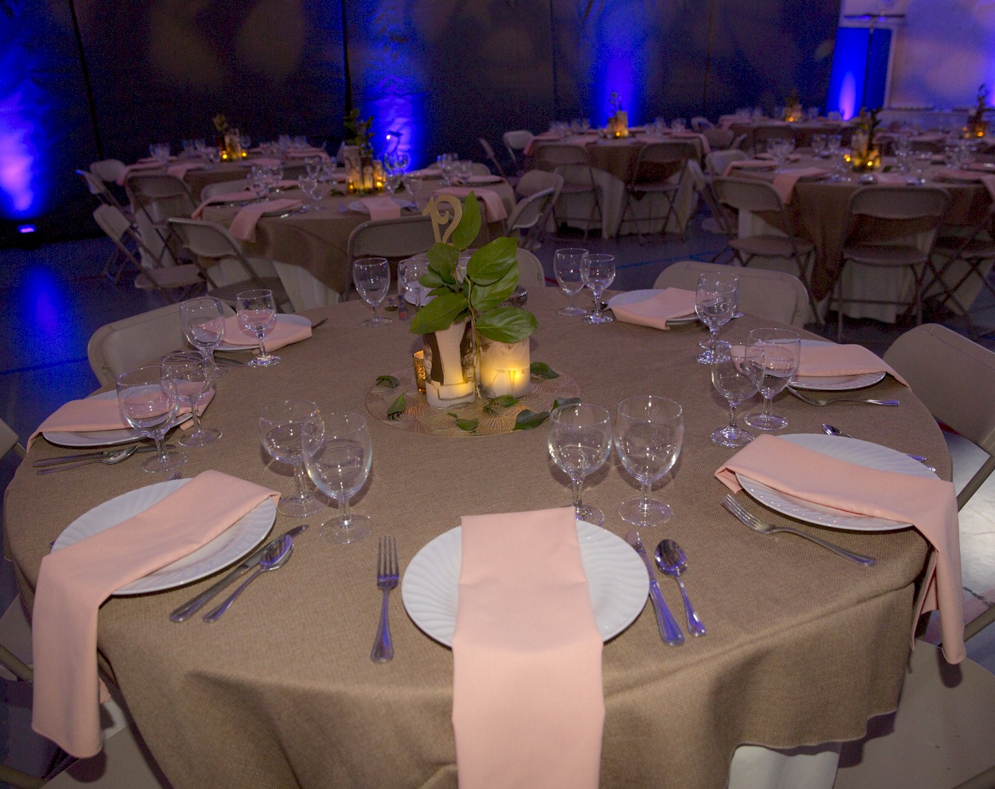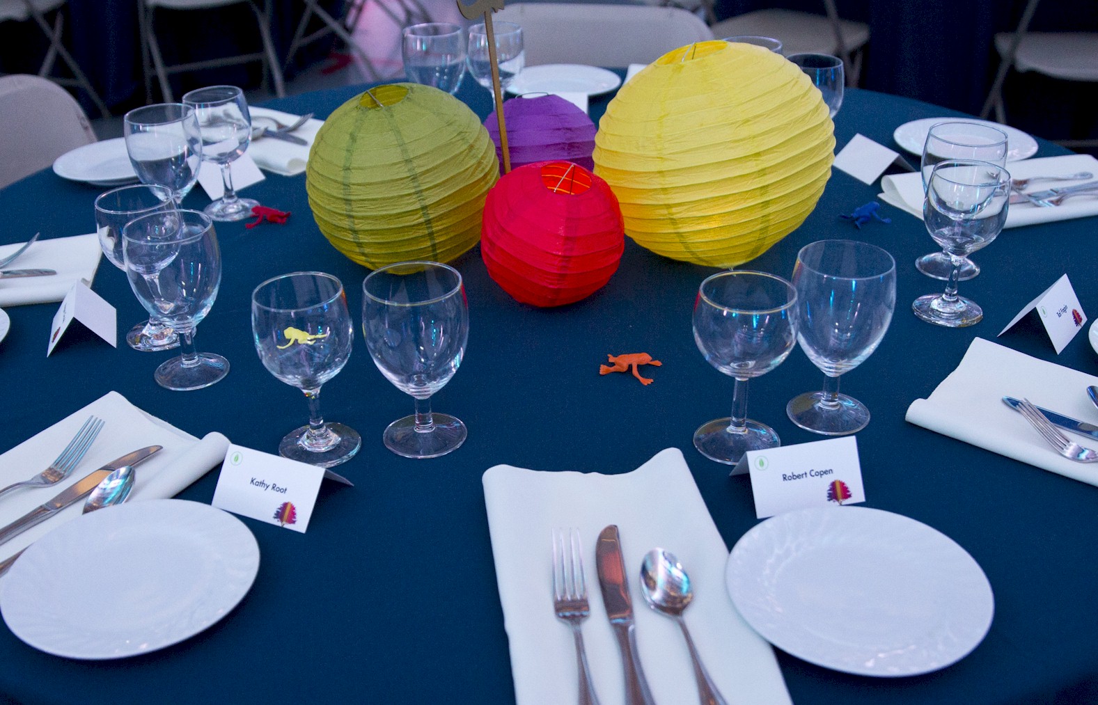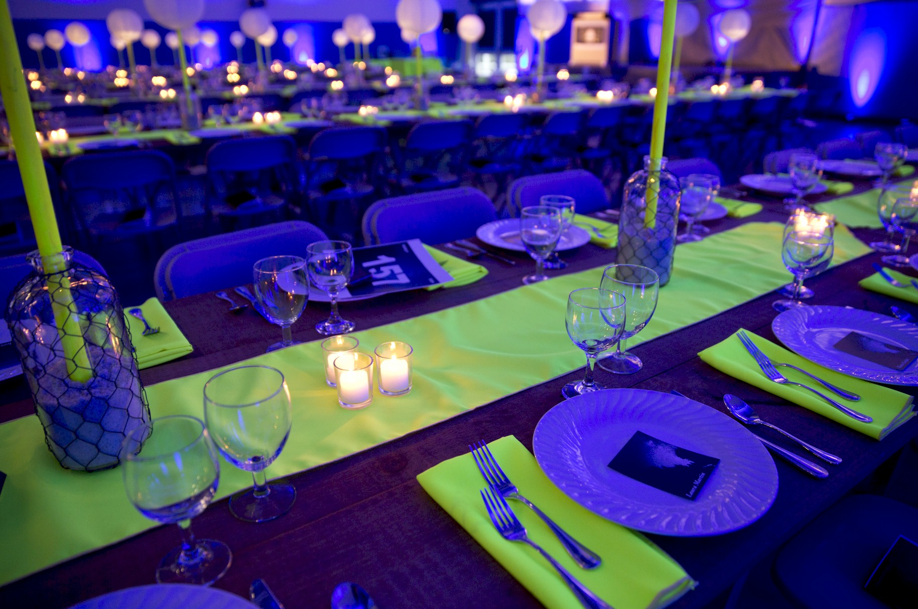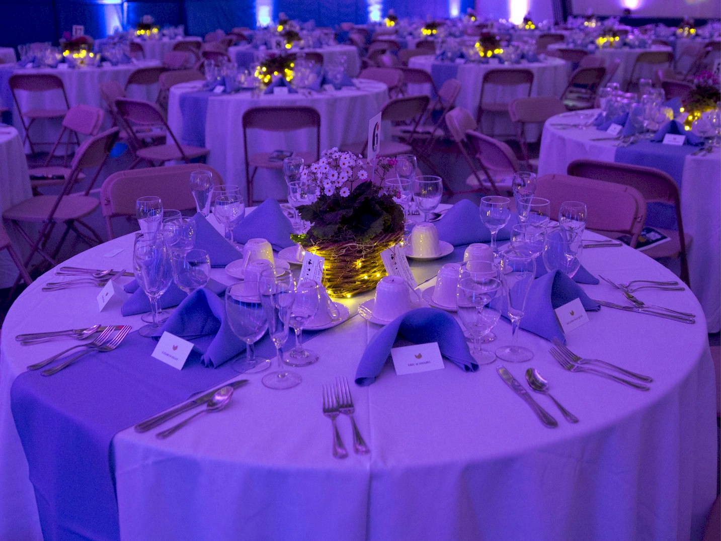 Flashy table setup prior to corporate function with gold lame and royal blue