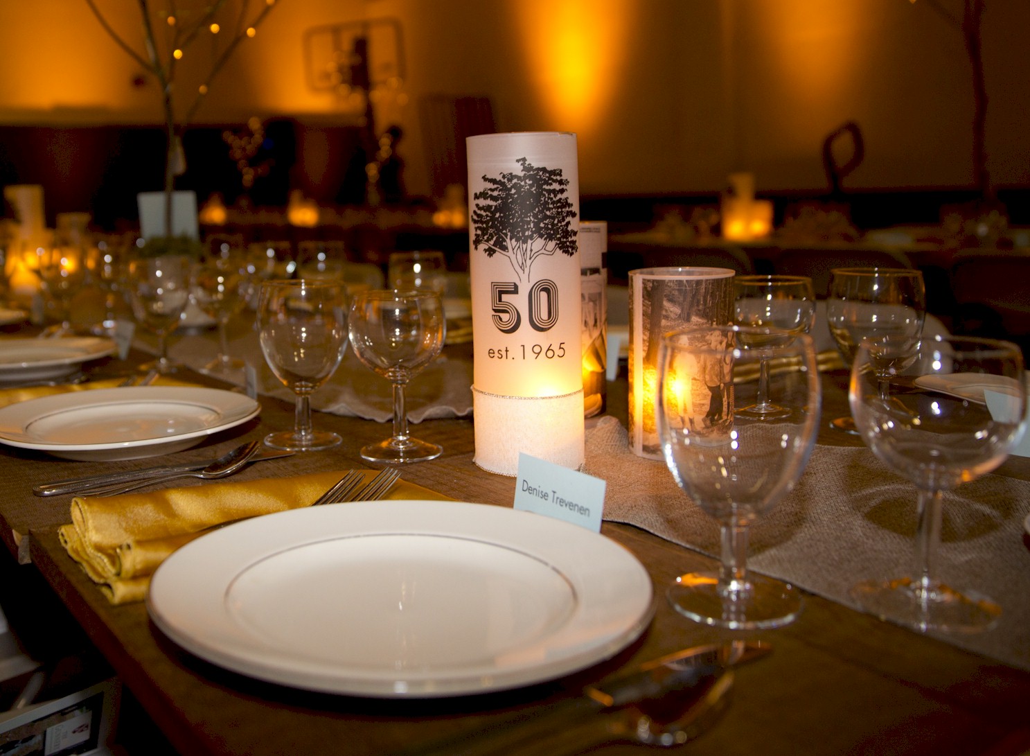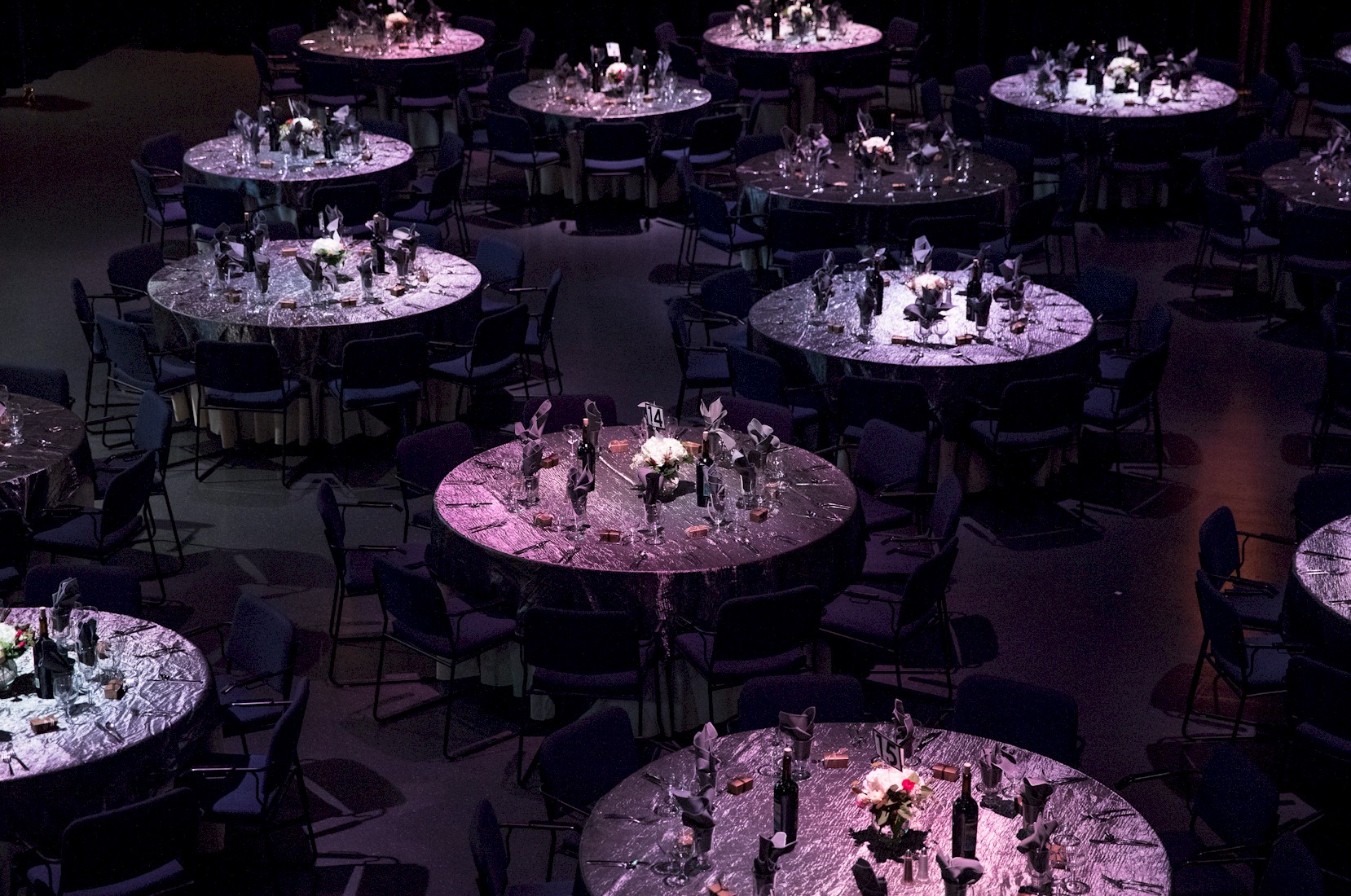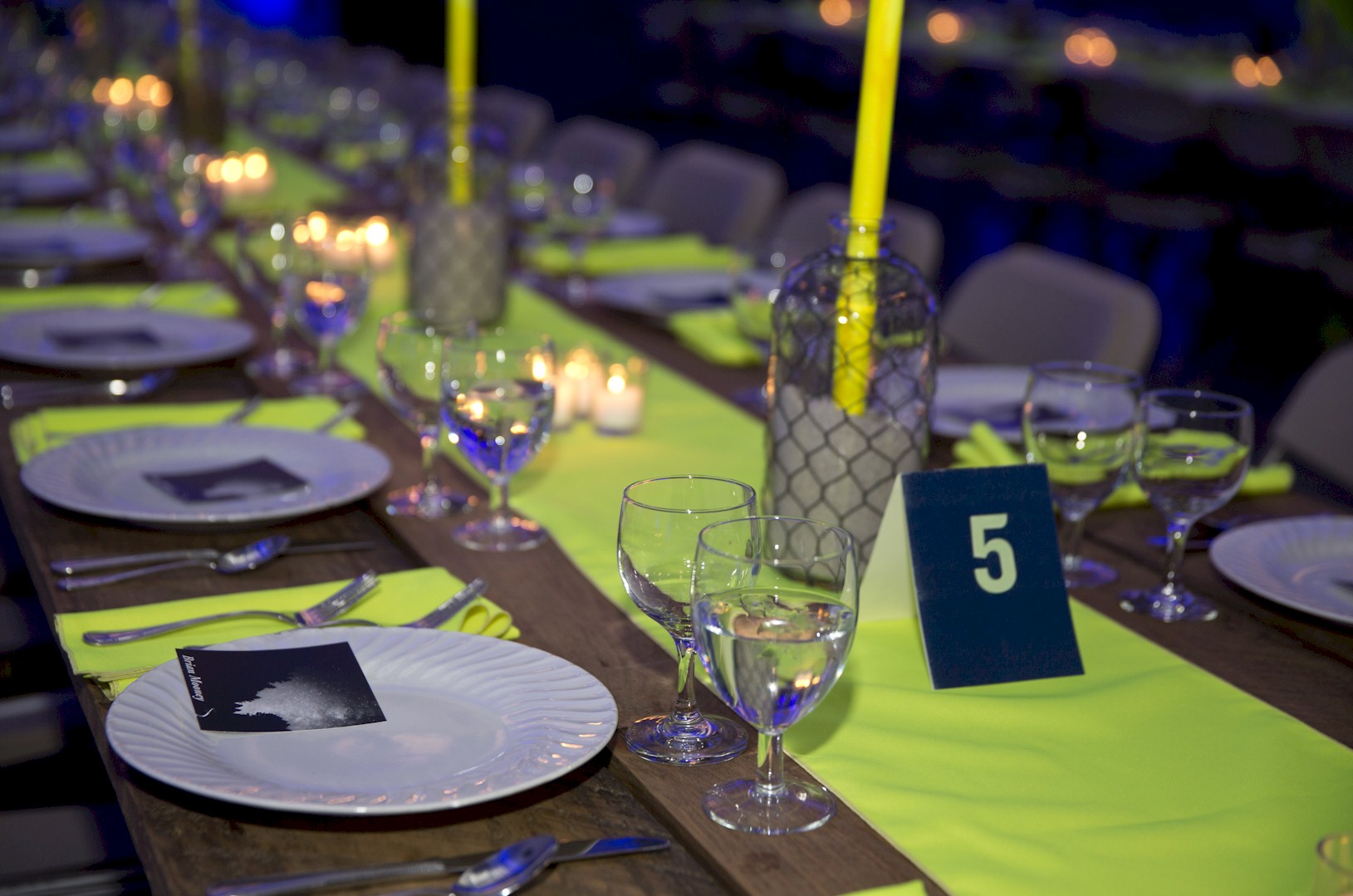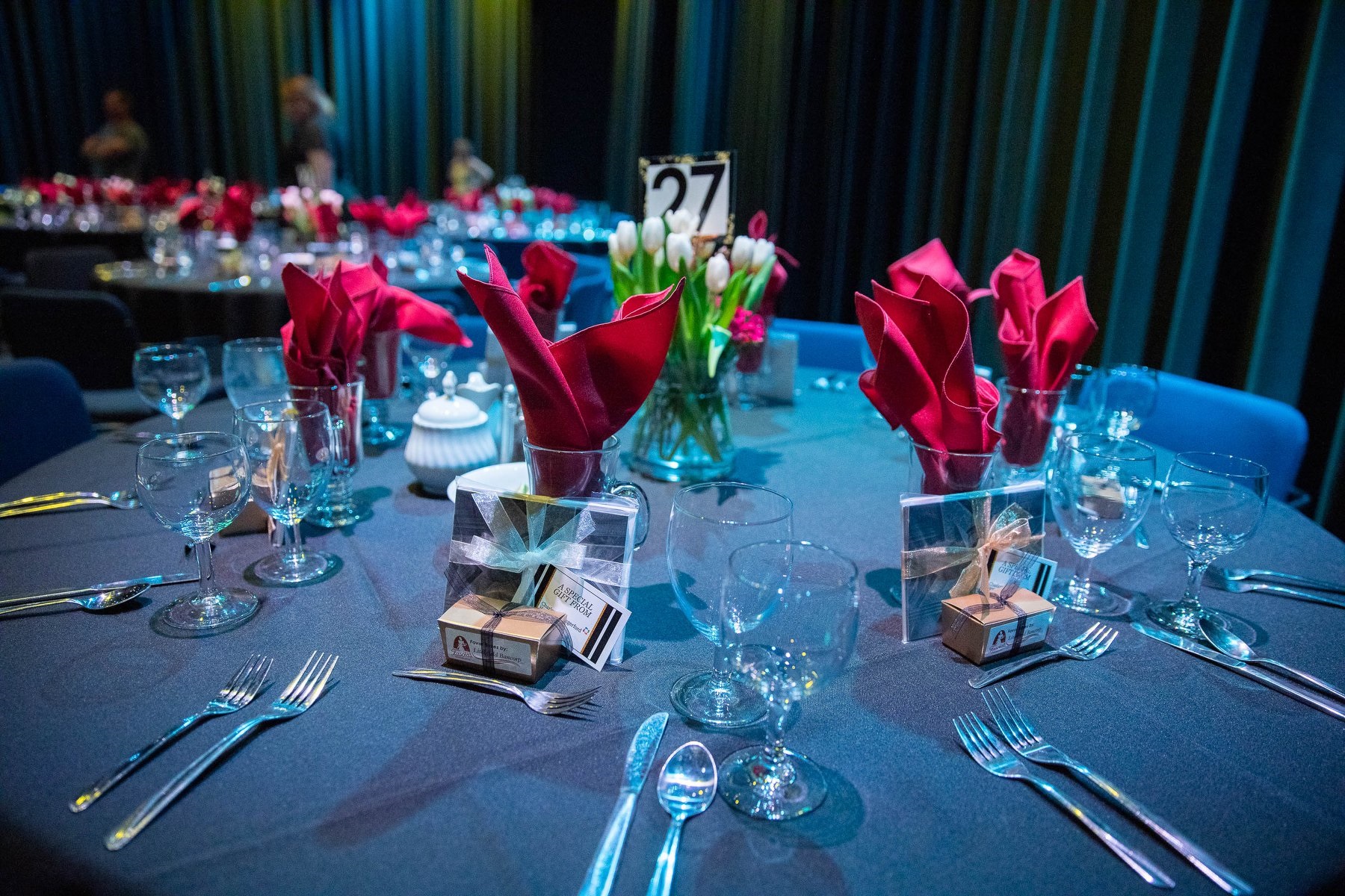 Flashy table setup prior to corporate function with gold lame and royal blue