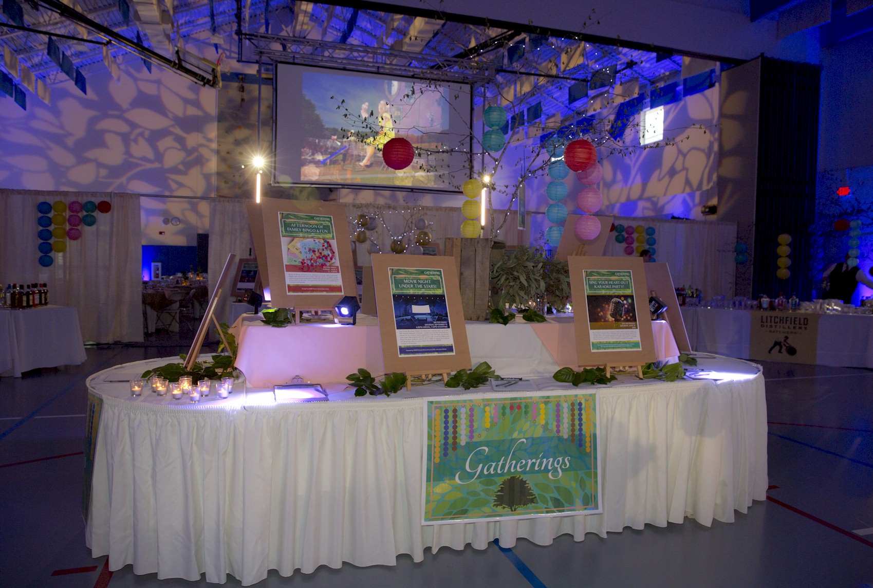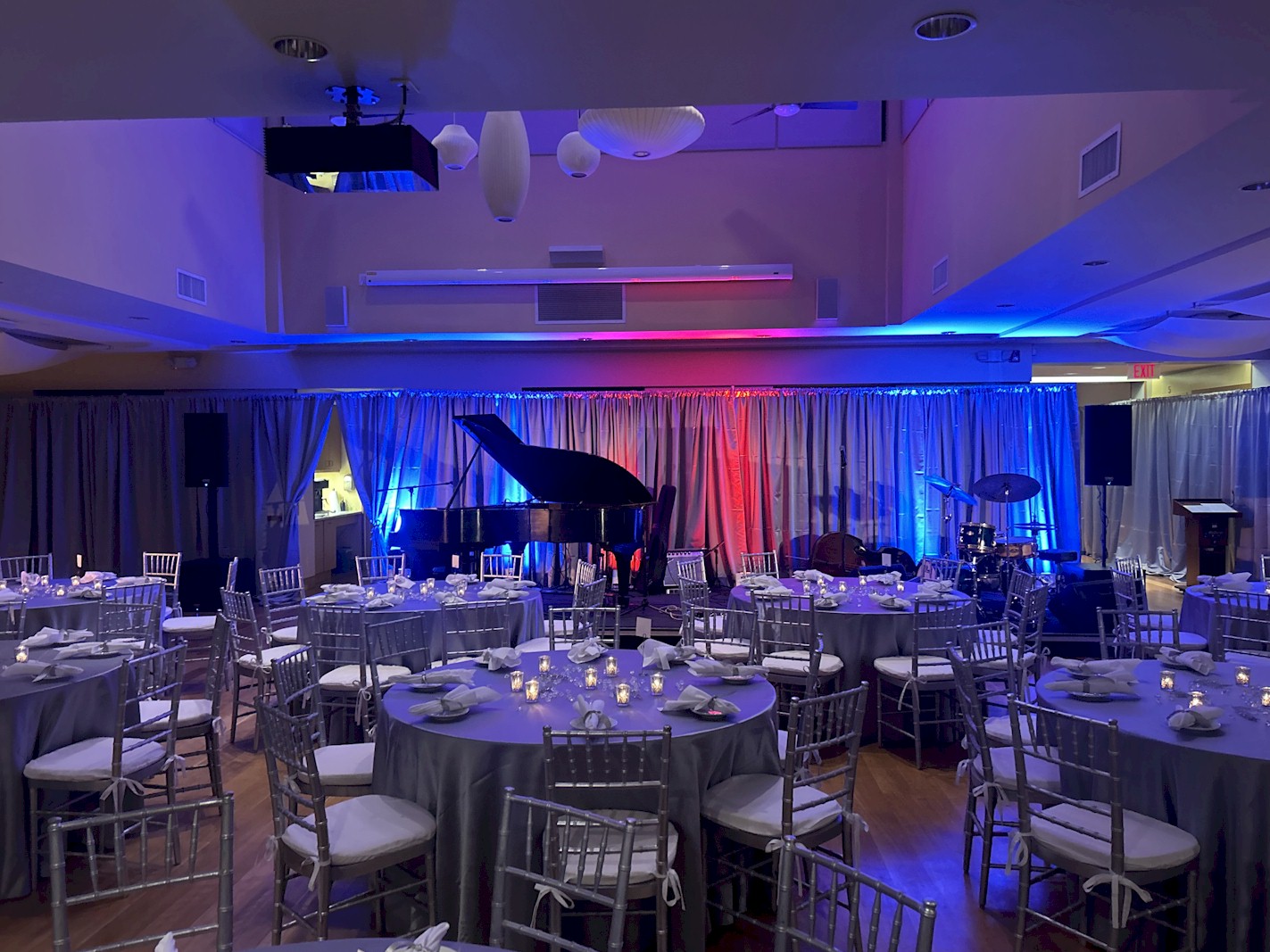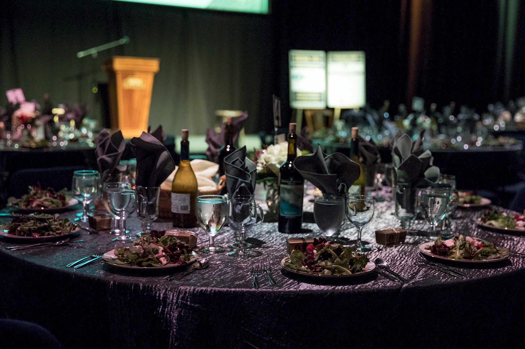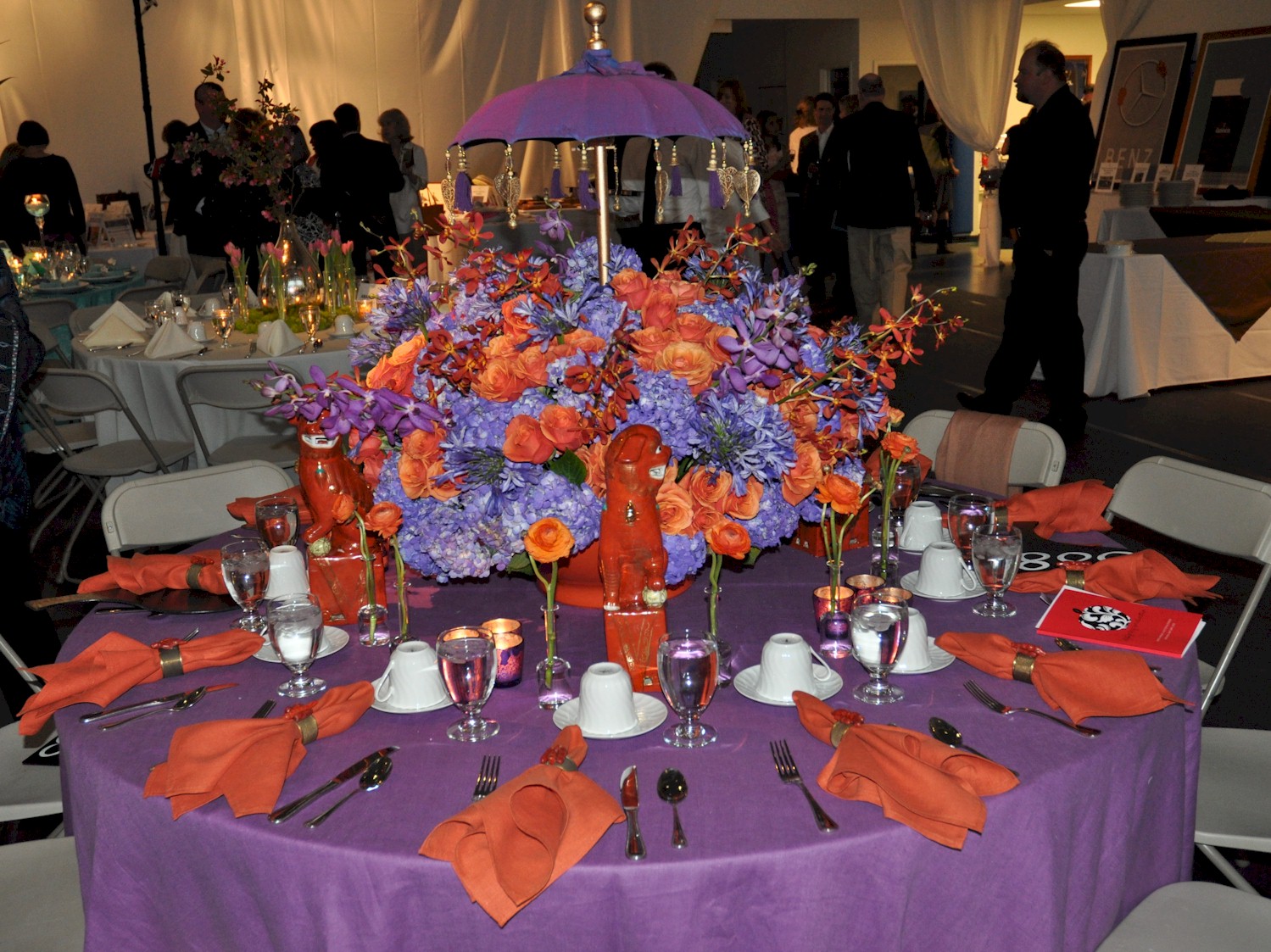 Flashy table setup prior to corporate function with gold lame and royal blue