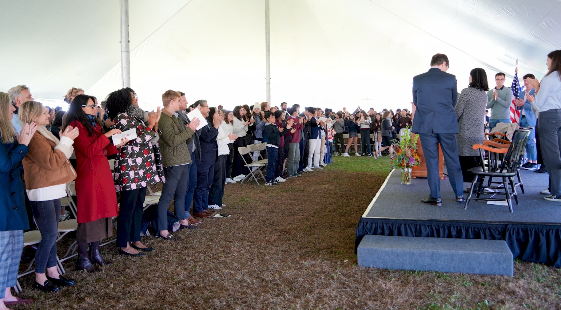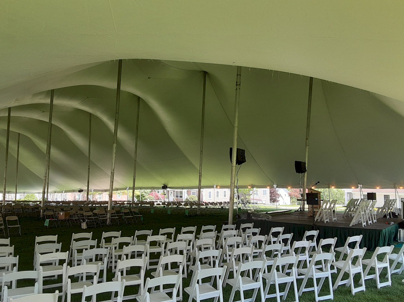 30×60 Pole Tent set with tables and chairs for a corporate event with american flag in the background.