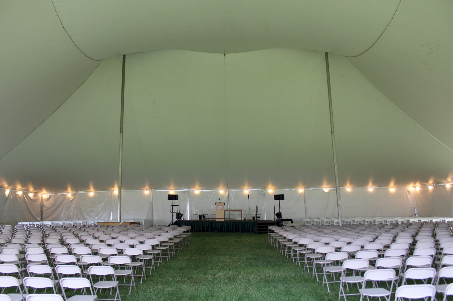 Large pole tent with decorated center poles, Full table settings with linens and white party chairs