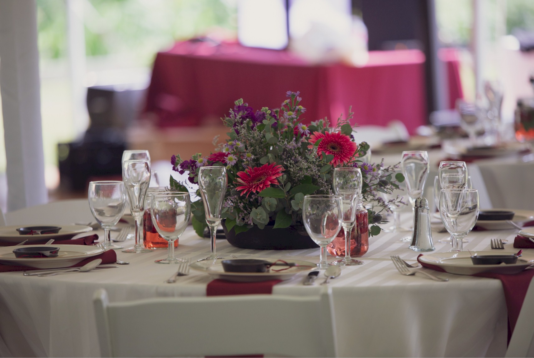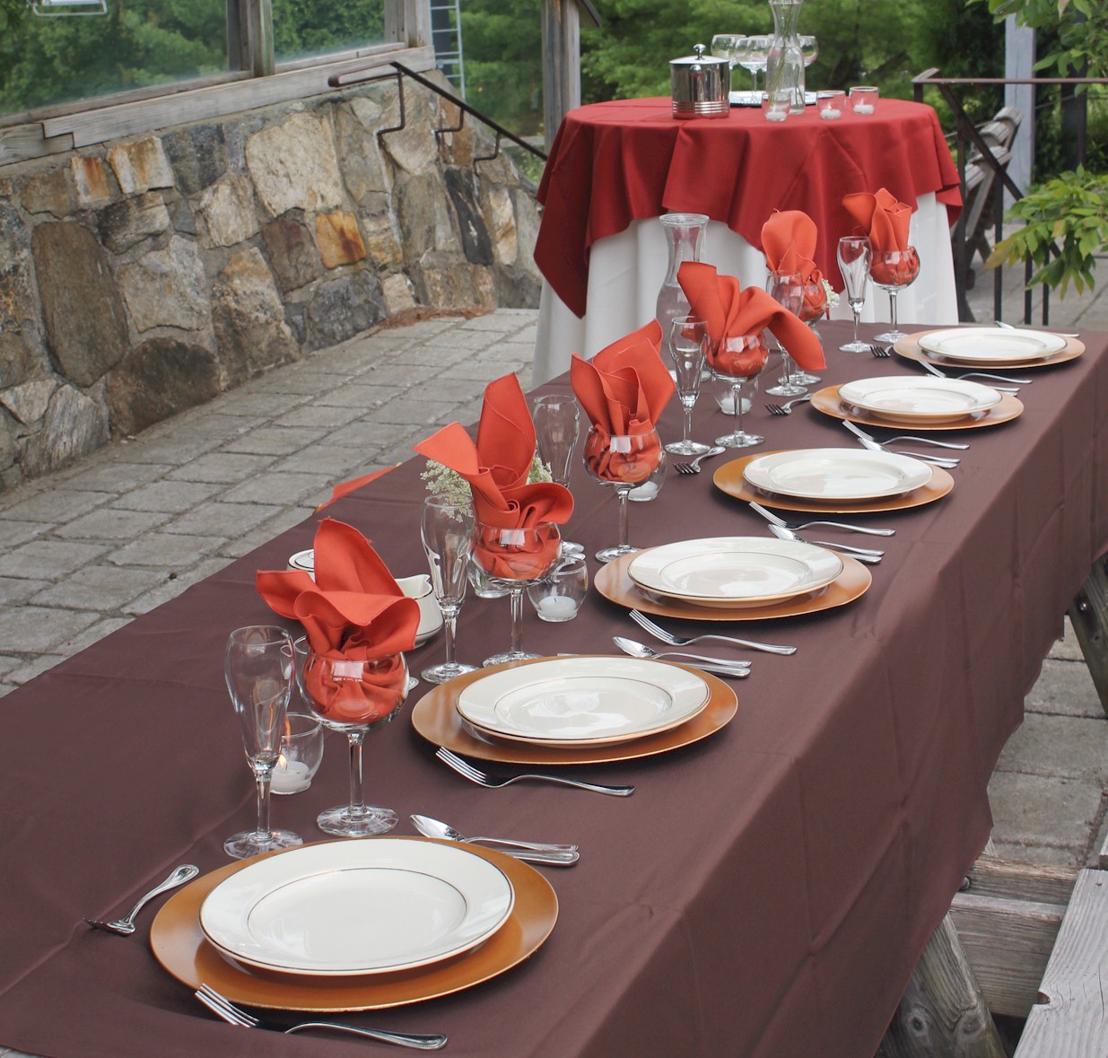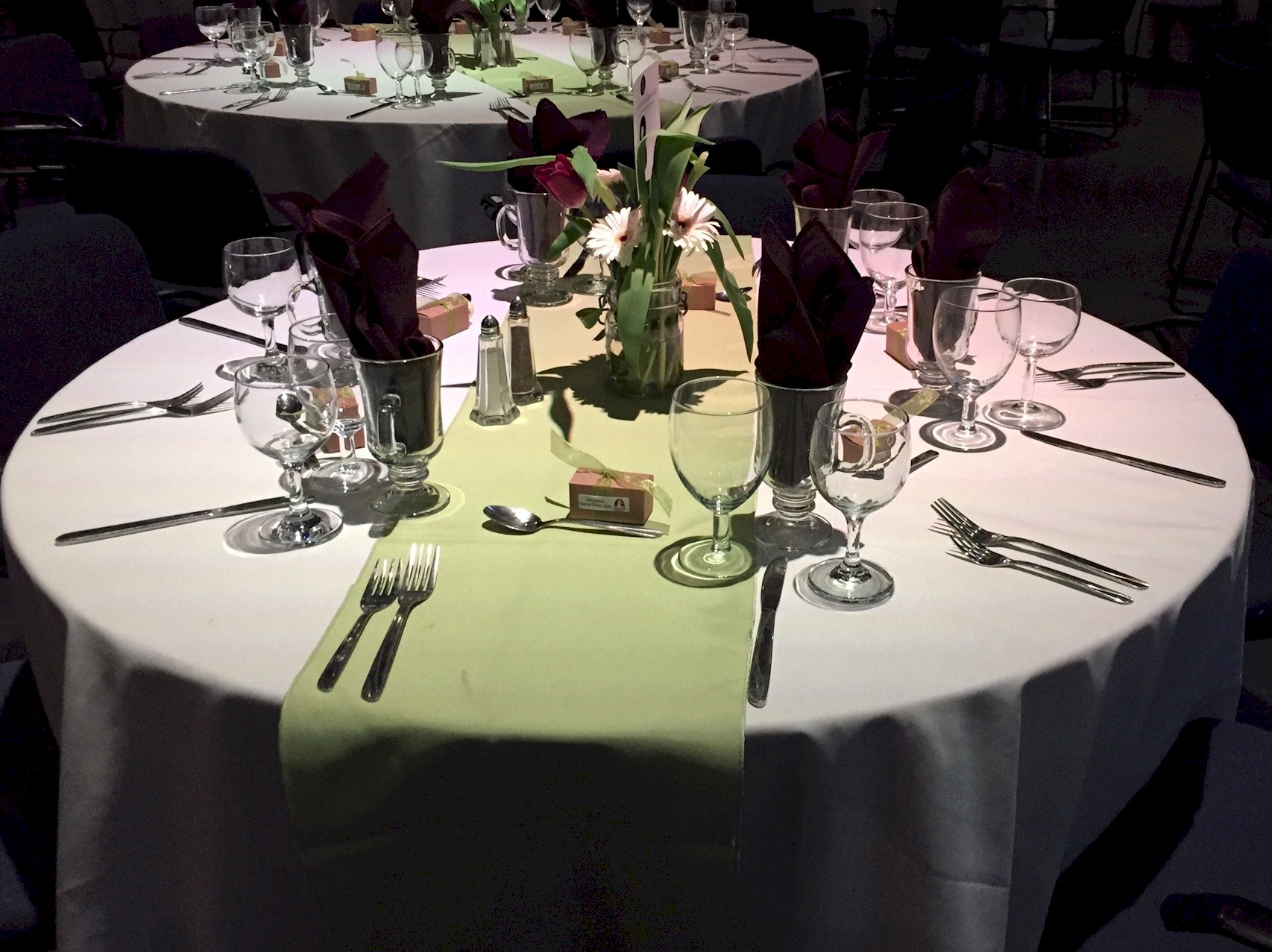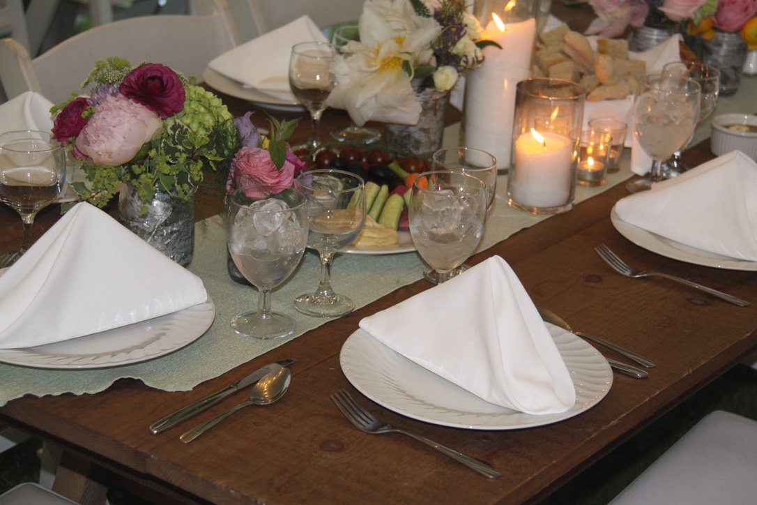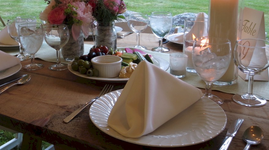 Simple Buffet Table Setting with Water Goblet, Wine Glass, and White Napkin set prior to a wedding