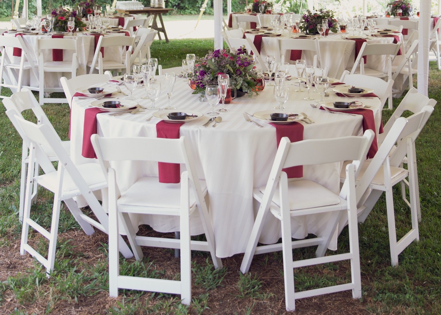 Simple setting with white party chairs and white stripe tablecloths