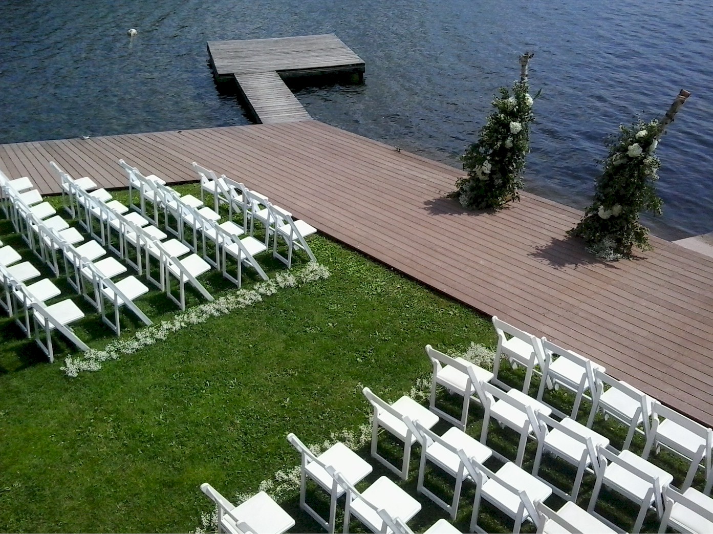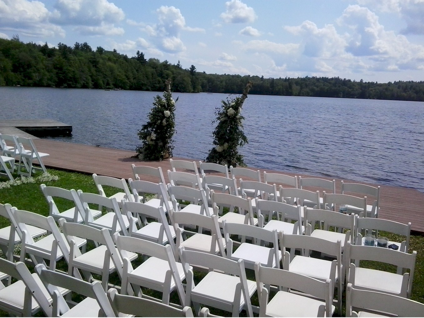 Samsonite Folding Chairs setup for a Wedding Ceremony with lake in background