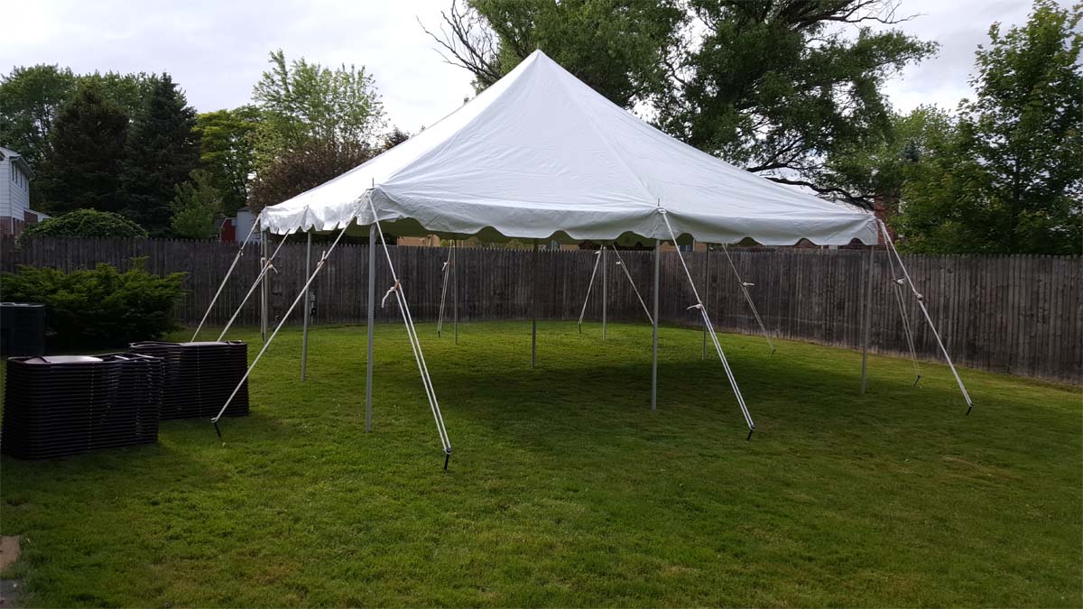 The 20×20 DIY tent can accommodate up to 40 seated guests or several serving tables. Please allow an additional 5′ around the tent for staking. With only 1 center pole, this is party workhorse! Set up can generally be accomplished in under 1/2 hour with 2 or more people. A $50 deposit is required to confirm a hold on these tents.