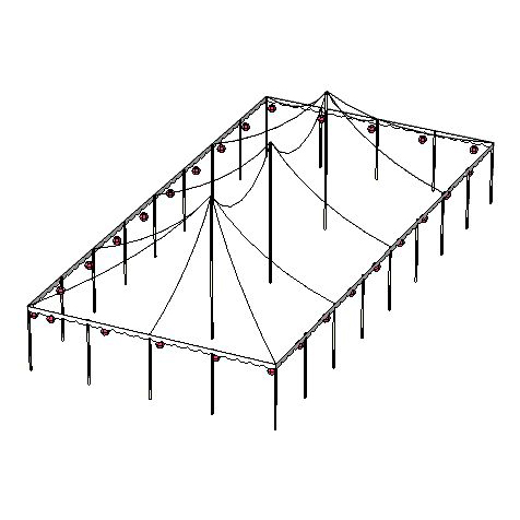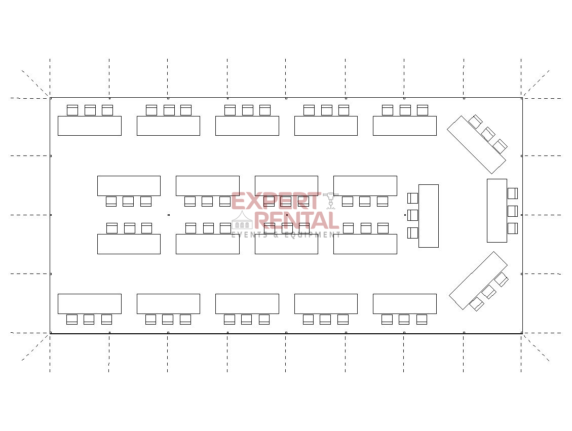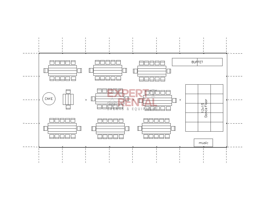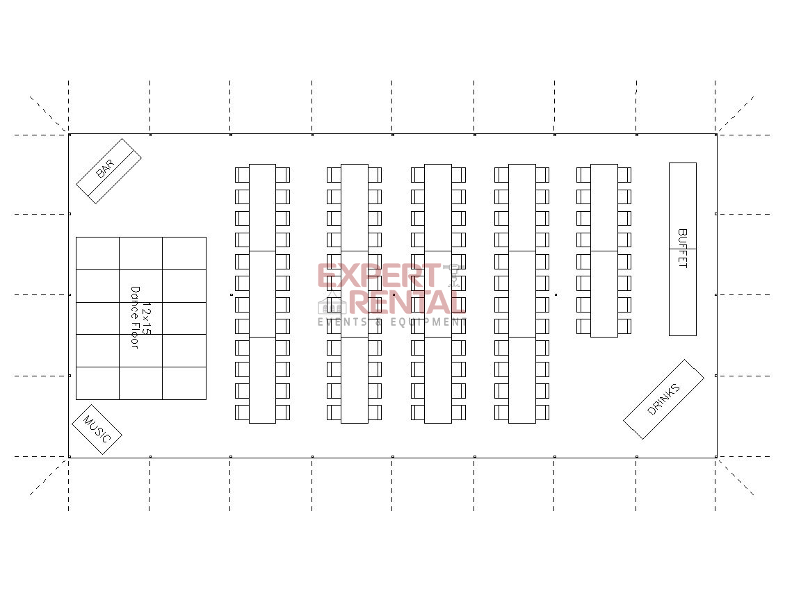 A 30×60 can seat up to 180 guests for dining. This tent has 3 center poles, and is a very popular size for mid-size wedding and event celebrations. Don’t forget in your planning to subtract area needed for dancing, buffet tables & bars when calculating the total guests you wish to seat.