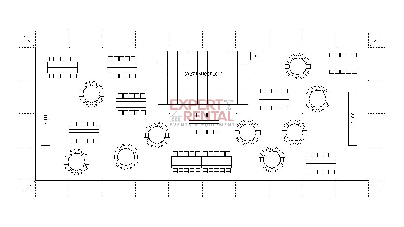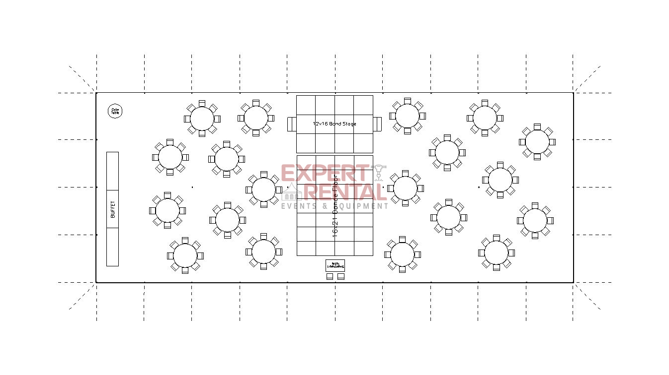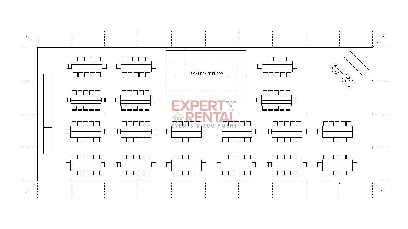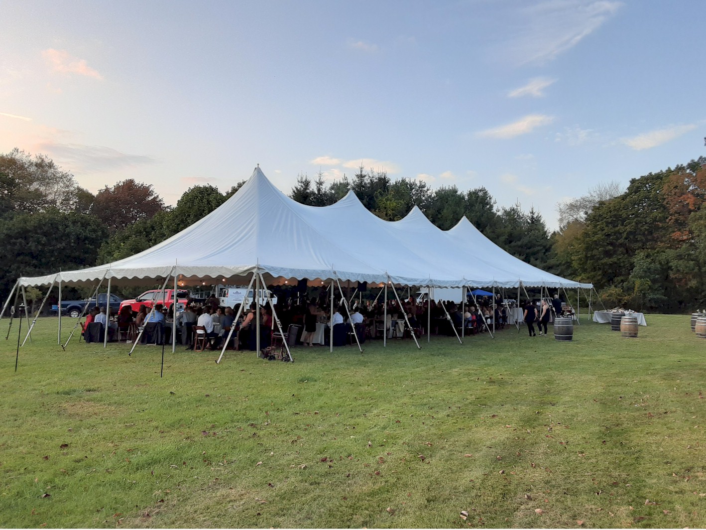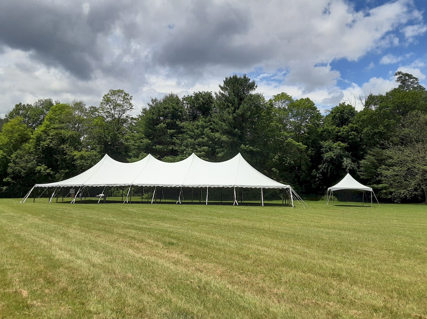 40′ x 100′ Pole Tent - $3410 With 4 center poles and a beautiful swooping ceiling, A 40’×100′ tent will accommodate up to 400 seated guests at long tables or 600 for a ceremony or standing room event. Consider this size tent for a party/event of up to 250 guests.
