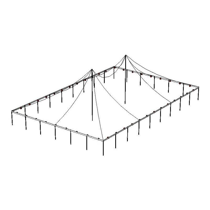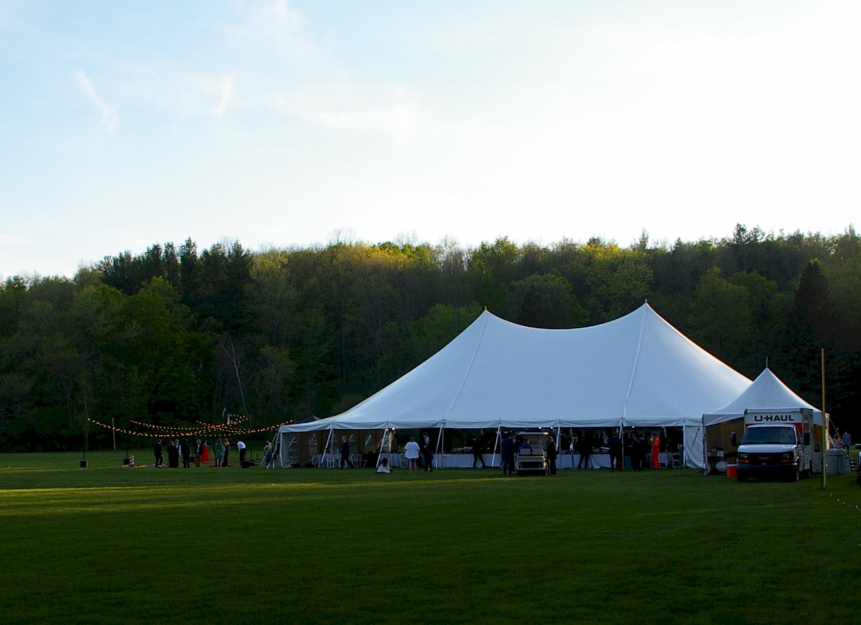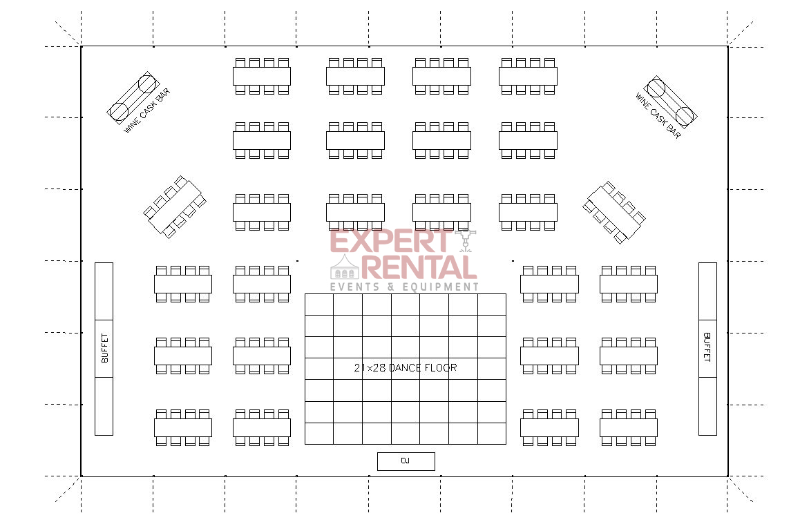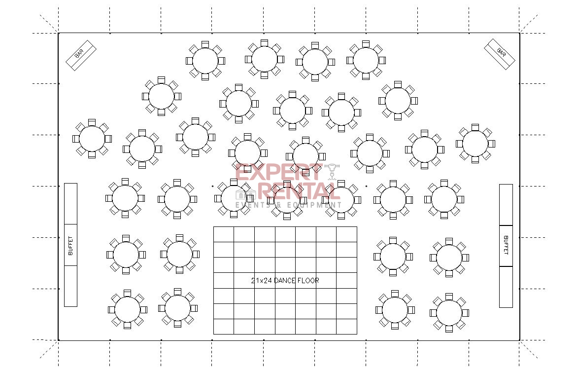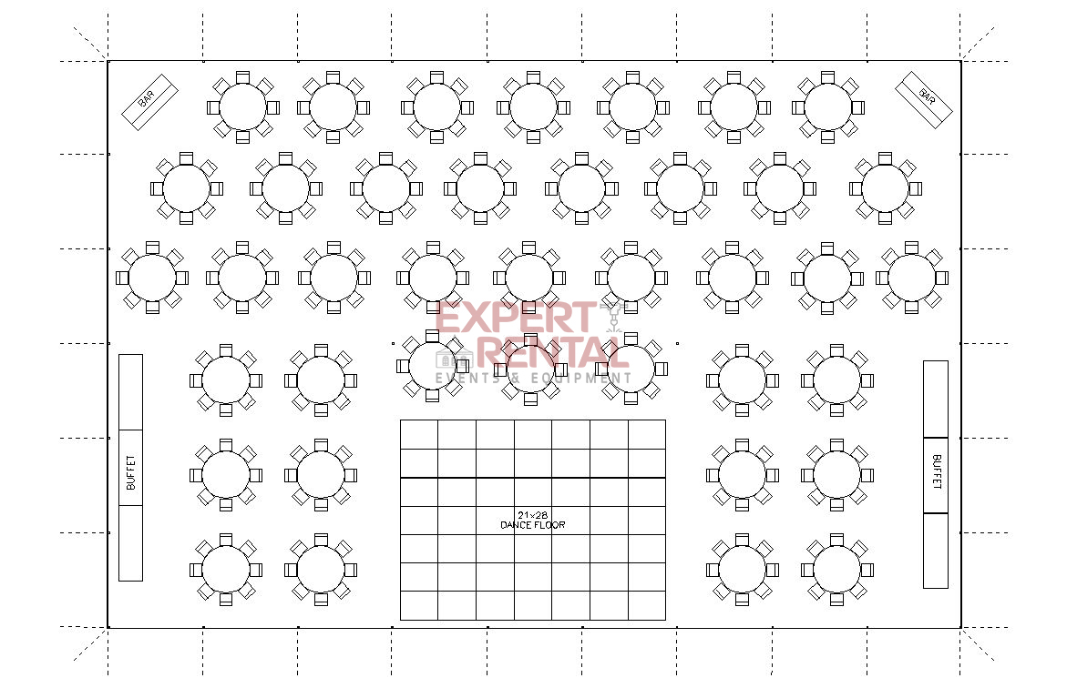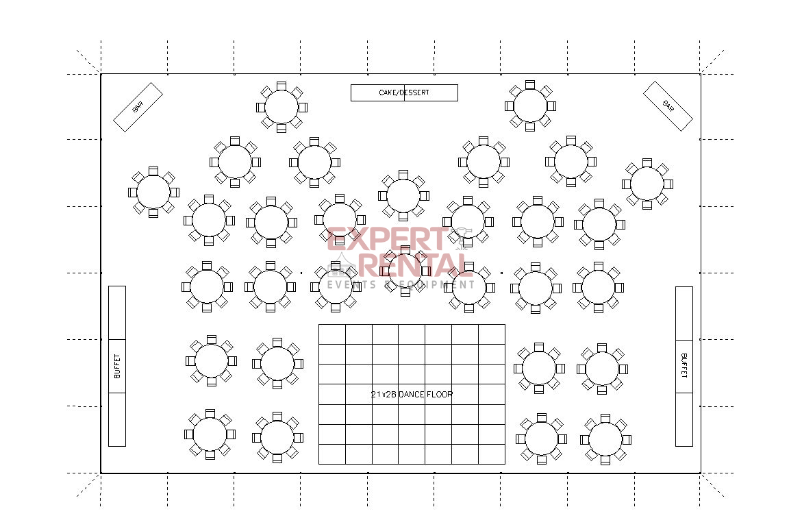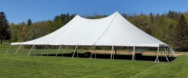 A 60’×90′ tent will accommodate up to 540 seated guests at long or round tables or 800 for a ceremony or standing room event. With only 2 center poles, this tent is perhaps our most beautiful offering. Consider this size tent for a party/event of up to 250 guests with plenty of room for dancing and mingling.