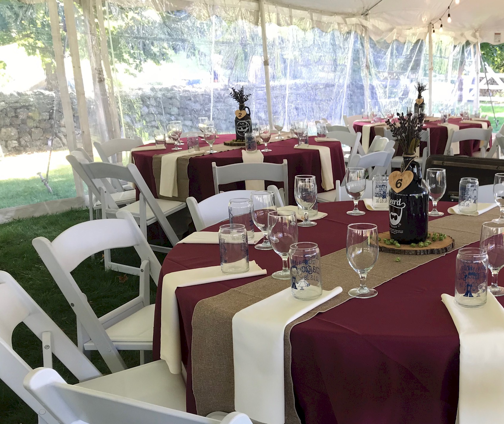 Tent walls do not come installed and are delivered to you rolled in bags and left under the tent with the other rented items. All of our tents have a rope that runs around the perimeter edge (as pictured below) that the walls clip to. So it’s easy to just roll them out and clip them up where ever and whenever it is needed around the tent.