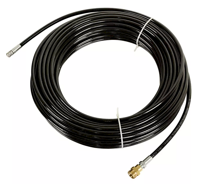This flexible hose has a special nozzle that attaches to a pressure washer, using powerful jets of water to blast through stubborn clogs, scrub pipe walls, and flush out grease, sludge, and debris from drains, and sewers, pulling itself through pipes and corners with backfiring jets while a forward jet breaks up obstructions.
